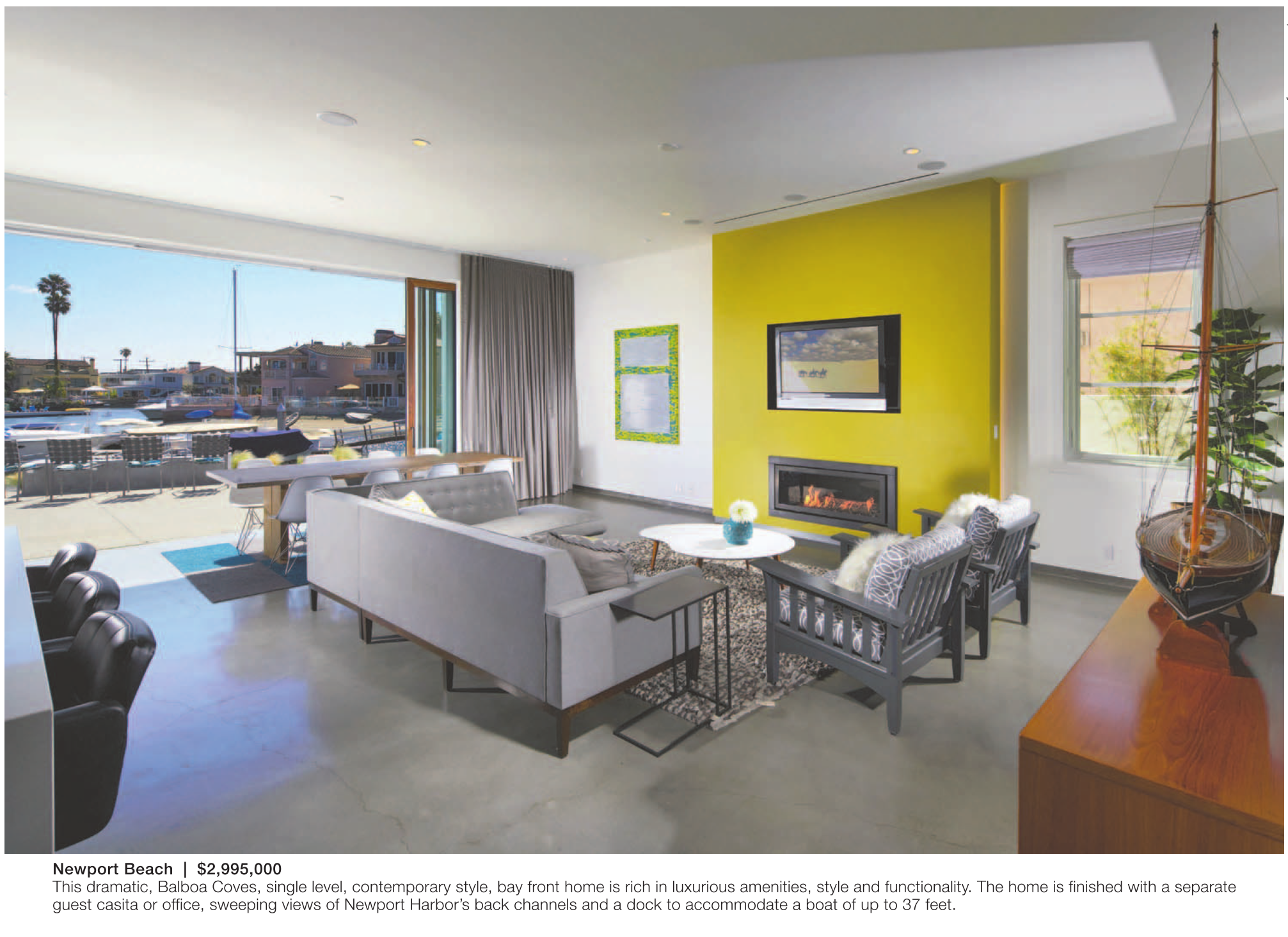 Newport Beach | $2,995,000 This dramatic, Balboa Coves, single level, contemporary style, bay front home is rich in luxurious amenities, style and functionality. The home is finished with a separate guest casita or office, sweeping views of Newport Harbor’s back channels and a dock to accommodate a boat of up to 37 feet.