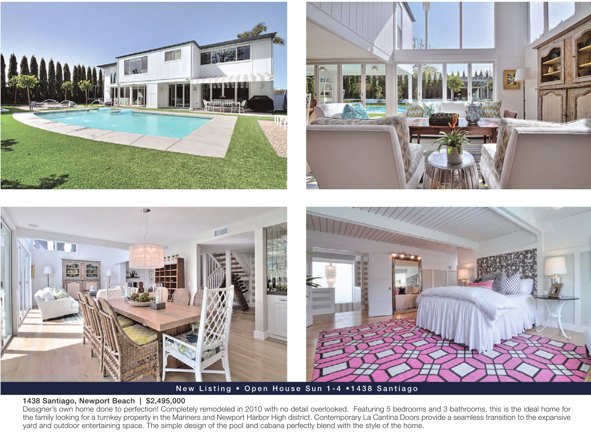 New Listing • Open House Sun 1-4 •1438 Santiago 1438 Santiago, Newport Beach | $2,495,000 Designer’s own home done to perfection! Completely remodeled in 2010 with no detail overlooked. Featuring 5 bedrooms and 3 bathrooms, this is the ideal home for the family looking for a turnkey property in the Mariners and Newport Harbor High district. Contemporary La Cantina Doors provide a seamless transition to the expansive yard and outdoor entertaining space. The simple design of the pool and cabana perfectly blend with the style of the home.