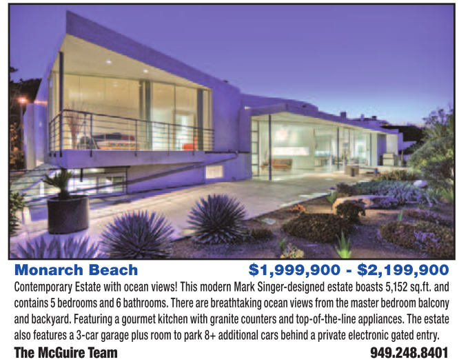 Monarch Beach $1,999,900 - $2,199,900 Contemporary Estate with ocean views! This modern Mark Singer-designed estate boasts 5,152 sq.ft. and contains 5 bedrooms and 6 bathrooms. There are breathtaking ocean views from the master bedroom balcony and backyard. Featuring a gourmet kitchen with granite counters and top-of-the-line appliances. The estate also features a 3-car garage plus room to park 8+ additional cars behind a private electronic gated entry. The McGuire Team 949.248.8401