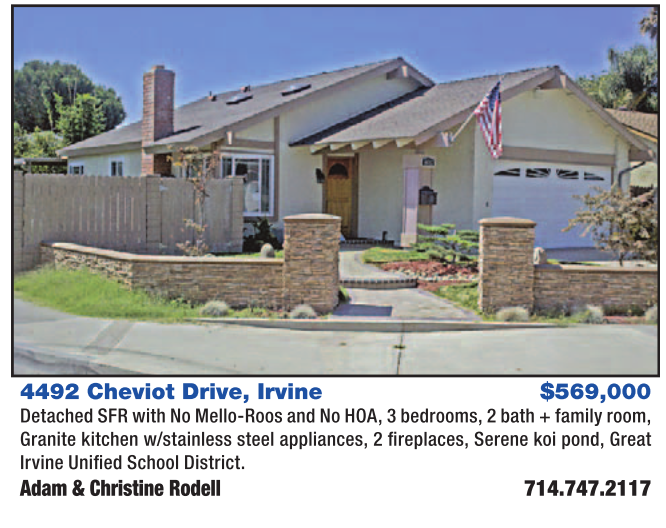 4492 Cheviot Drive, Irvine $569,000 Detached SFR with No Mello-Roos and No HOA, 3 bedrooms, 2 bath + family room, Granite kitchen w/stainless steel appliances, 2 fireplaces, Serene koi pond, Great Irvine Unified School District. Adam & Christine Rodell 714.747.2117