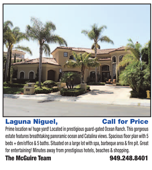 Laguna Niguel, Call for Price Prime location w/ huge yard! Located in prestigious guard-gated Ocean Ranch. This gorgeous estate features breathtaking panoramic ocean and Catalina views. Spacious floor plan with 5 beds + den/office & 5 baths. Situated on a large lot with spa, barbeque area & fire pit. Great for entertaining! Minutes away from prestigious hotels, beaches & shopping. The McGuire Team 949.248.8401