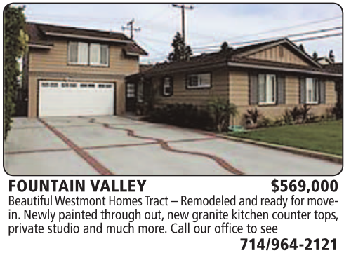 FOUNTAIN VALLEY $569,000 Beautiful Westmont Homes Tract – Remodeled and ready for movein. Newly painted through out, new granite kitchen counter tops, private studio and much more. Call our office to see 714/964-2121