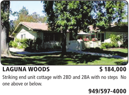 LAGUNA WOODS $ 184,000 Striking end unit cottage with 2BD and 2BA with no steps No one above or below.