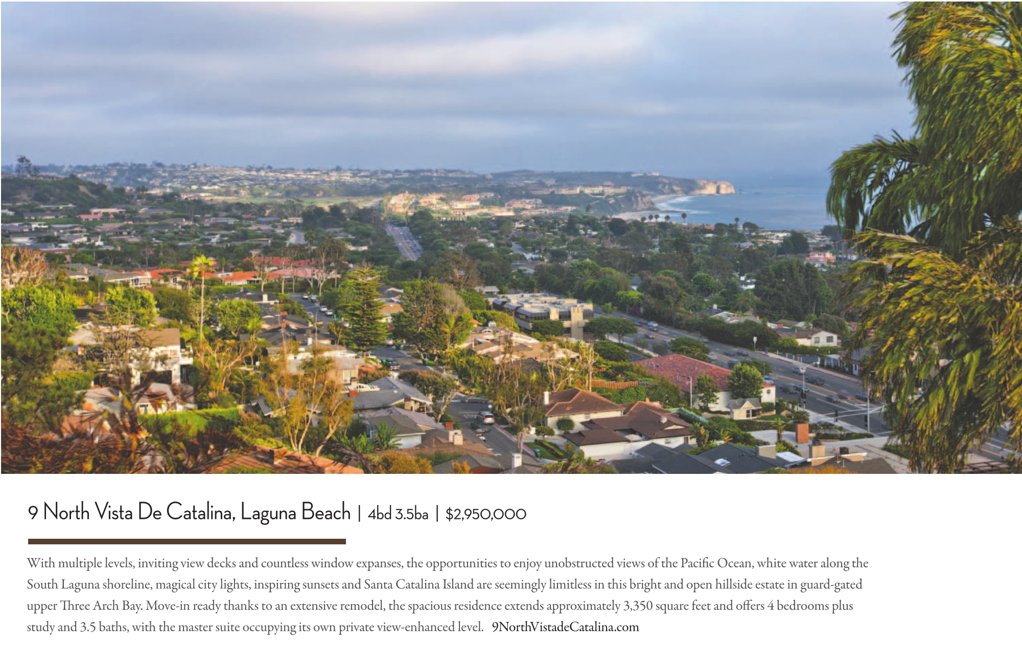 With multiple levels, inviting view decks and countless window expanses, the opportunities to enjoy unobstructed views of the Pacific Ocean, white water along the South Laguna shoreline, magical city lights, inspiring sunsets and Santa Catalina Island are seemingly limitless in this bright and open hillside estate in guard-gated upper Three Arch Bay. Move-in ready thanks to an extensive remodel, the spacious residence extends approximately 3,350 square feet and offers 4 bedrooms plus study and 3.5 baths, with the master suite occupying its own private view-enhanced level. 9NorthVistadeCatalina.com