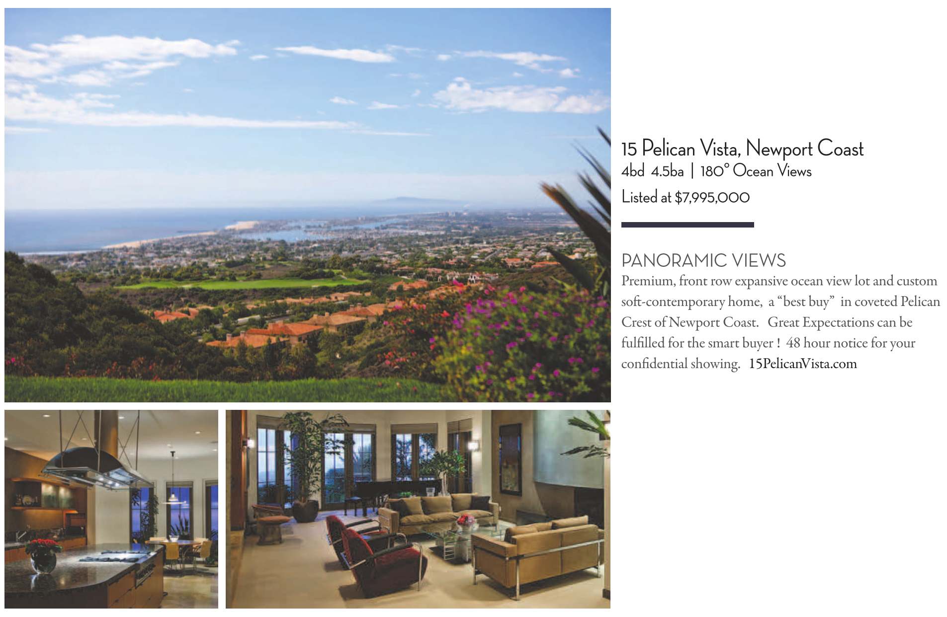 15 Pelican Vista, Newport Coast 4bd 4.5ba | 180° Ocean Views Listed at $7,995,000 PANORAMIC VIEWS Premium, front row expansive ocean view lot and custom soft-contemporary home, a “best buy” in coveted Pelican Crest of Newport Coast. Great Expectations can be fulfilled for the smart buyer ! 48 hour notice for your confidential showing. 15PelicanVista.com