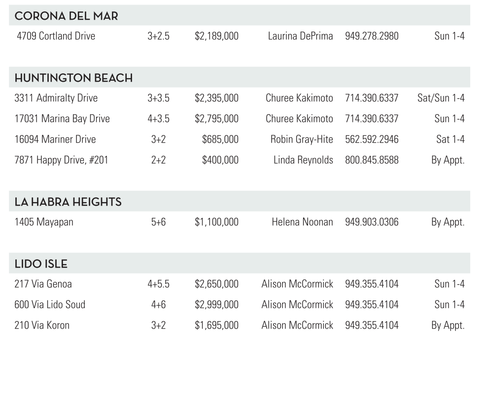HUNTINGTON BEACH 3311 Admiralty Drive 3+3.5 $2,395,000 Churee Kakimoto 714.390.6337 Sat/Sun 1-4 17031 Marina Bay Drive 4+3.5 $2,795,000 Churee Kakimoto 714.390.6337 Sun 1-4 16094 Mariner Drive 3+2 $685,000 Robin Gray-Hite 562.592.2946 Sat 1-4 7871 Happy Drive, #201 2+2 $400,000 Linda Reynolds 800.845.8588 By Appt.