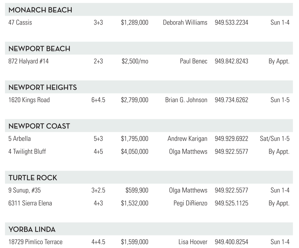 NEWPORT COAST 5 Arbella 5+3 $1,795,000 Andrew Karigan 949.929.6922 Sat/Sun 1-5 4 Twilight Bluff 4+5 $4,050,000 Olga Matthews 949.922.5577 By Appt.