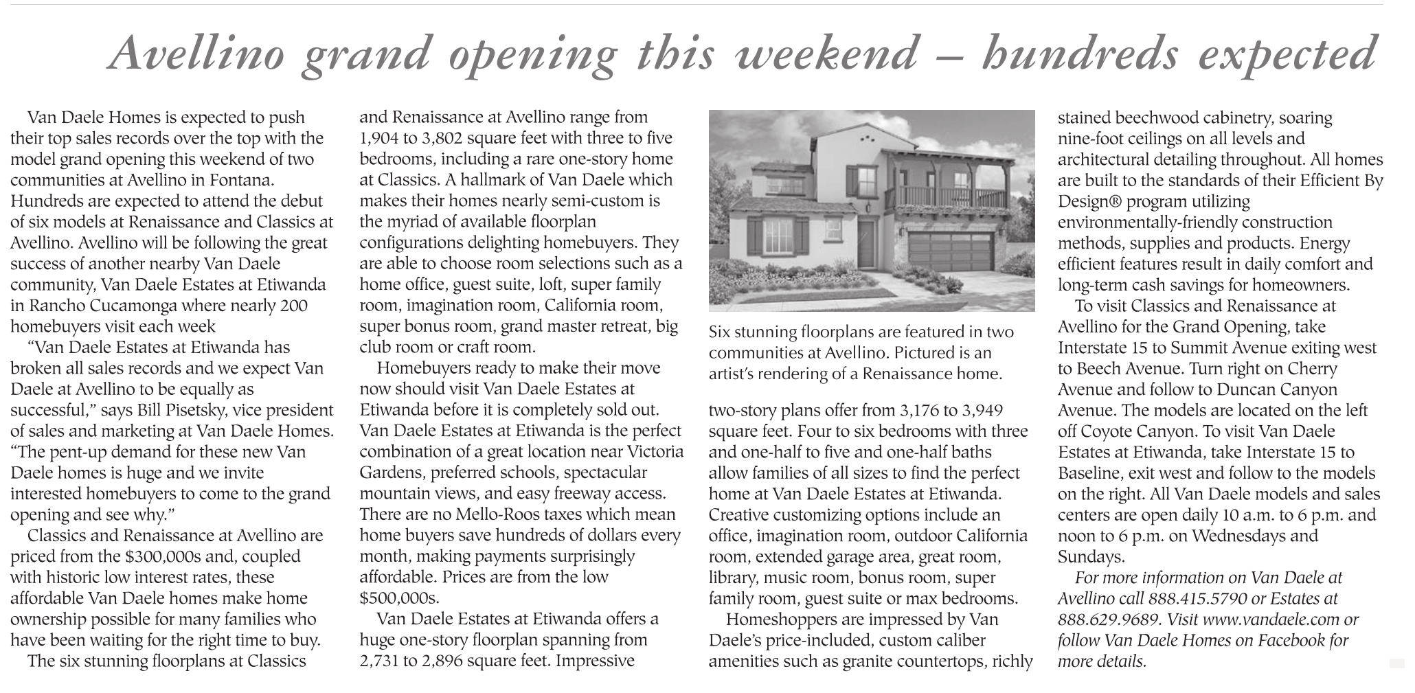 Van Daele Homes is expected to push their top sales records over the top with the model grand opening this weekend of two communities at Avellino in Fontana. Hundreds are expected to attend the debut of six models at Renaissance and Classics at Avellino. Avellino will be following the great success of another nearby Van Daele community, Van Daele Estates at Etiwanda in Rancho Cucamonga where nearly 200 homebuyers visit each week “Van Daele Estates at Etiwanda has broken all sales records and we expect Van Daele at Avellino to be equally as successful,” says Bill Pisetsky, vice president of sales and marketing at Van Daele Homes. “The pent-up demand for these new Van Daele homes is huge and we invite interested homebuyers to come to the grand opening and see why.”