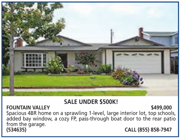 FOUNTAIN VALLEY $499,000 Spacious 4BR home on a sprawling 1-level, large interior lot, top schools, added bay window, a cozy FP, pass-through boat door to the rear patio from the garage. (534635) CALL (855) 858-7947
