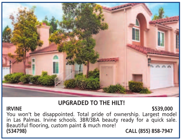 IRVINE $539,000 You won’t be disappointed. Total pride of ownership. Largest model in Las Palmas. Irvine schools. 3BR/3BA beauty ready for a quick sale. Beautiful flooring, custom paint & much more! (534798) CALL (855) 858-7947