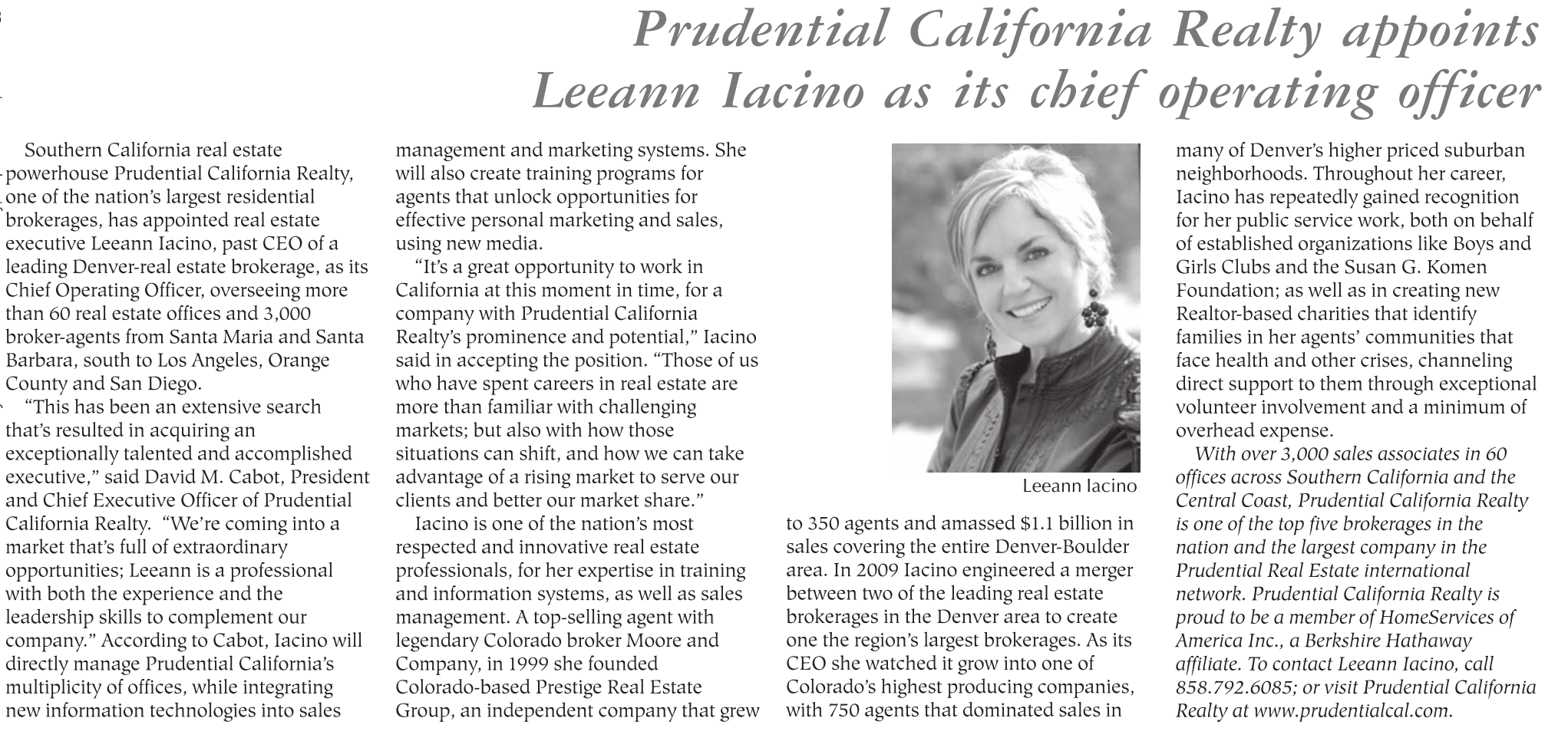 Southern California real estate powerhouse Prudential California Realty, one of the nation’s largest residential brokerages, has appointed real estate executive Leeann Iacino, past CEO of a leading Denver-real estate brokerage, as its Chief Operating Officer, overseeing more than 60 real estate offices and 3,000 broker-agents from Santa Maria and Santa Barbara, south to Los Angeles, Orange County and San Diego.
