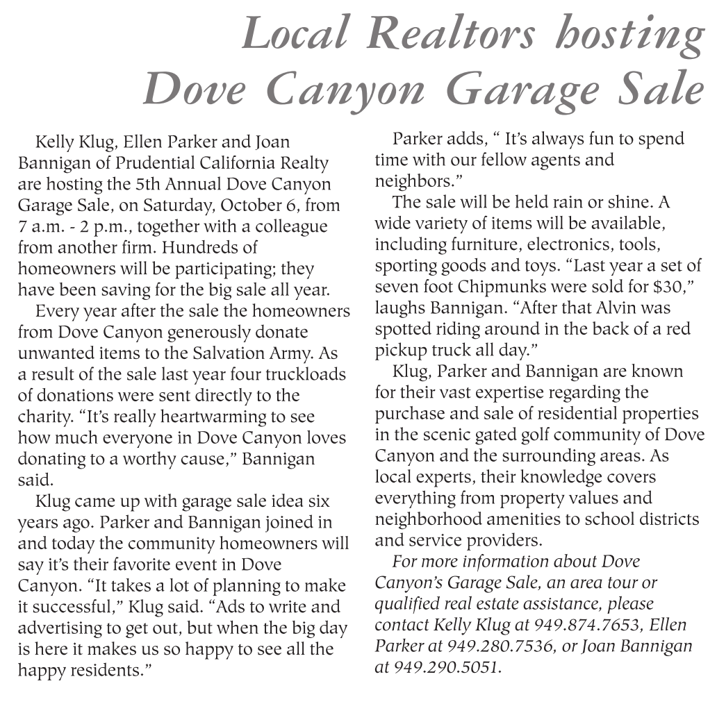 For more information about Dove Canyon’s Garage Sale, an area tour or qualified real estate assistance, please contact Kelly Klug at 949.874.7653, Ellen Parker at 949.280.7536, or Joan Bannigan at 949.290.5051.