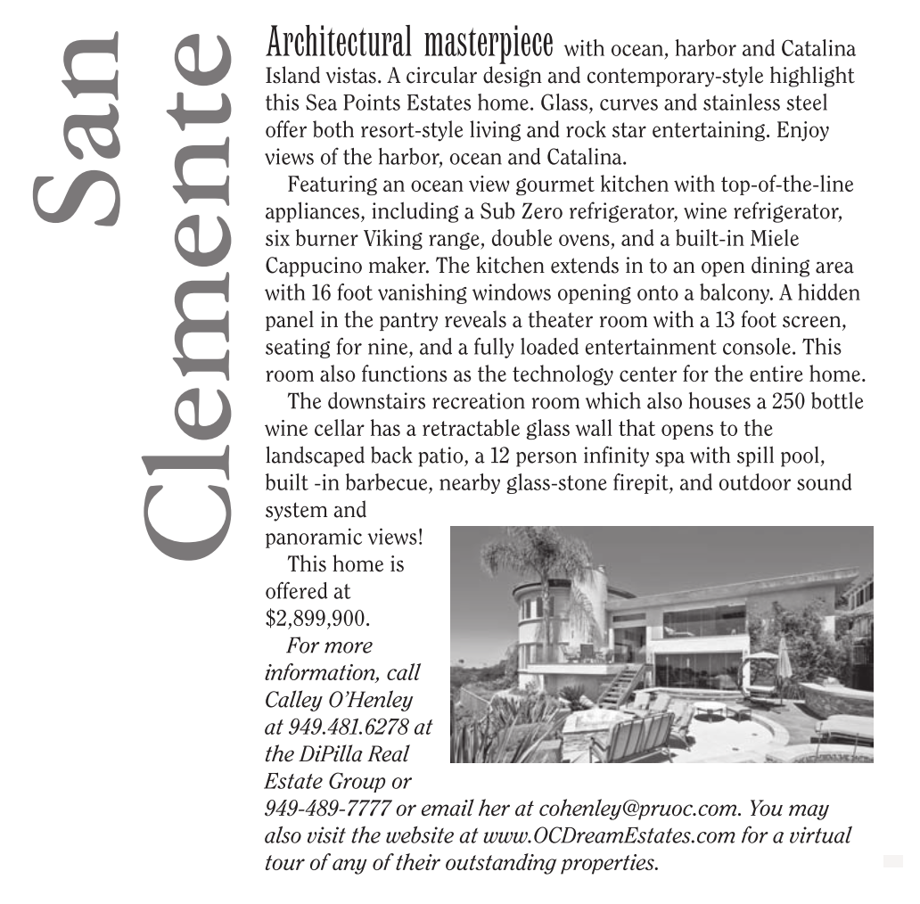 Architectural masterpiece with ocean, harbor and Catalina Island vistas. A circular design and contemporary-style highlight this Sea Points Estates home. Glass, curves and stainless steel offer both resort-style living and rock star entertaining. Enjoy views of the harbor, ocean and Catalina. Featuring an ocean view gourmet kitchen with top-of-the-line appliances, including a Sub Zero refrigerator, wine refrigerator, six burner Viking range, double ovens, and a built-in Miele Cappucino maker. The kitchen extends in to an open dining area with 16 foot vanishing windows opening onto a balcony. A hidden panel in the pantry reveals a theater room with a 13 foot screen, seating for nine, and a fully loaded entertainment console. This room also functions as the technology center for the entire home. The downstairs recreation room which also houses a 250 bottle wine cellar has a retractable glass wall that opens to the landscaped back patio, a 12 person infinity spa with spill pool, built -in barbecue, nearby glass-stone firepit, and outdoor sound system and panoramic views! This home is offered at $2,899,900. For more information, call Calley O’Henley at 949.481.6278 at the DiPilla Real Estate Group or 949-489-7777 or email her at cohenley@pruoc.com. You may also visit the website at www.OCDreamEstates.com for a virtual tour of any of their outstanding properties.