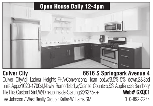 Culver City 6616 S Springpark Avenue 4 Culver CityAdj.-Ladera Heights-FHA/Conventional loan opt.w/3.5%-5% down,2&3bd units,Apprx1020-1700sf,Newly Remodeled,w/Granite Counters,SS Appliances,Bamboo/ Tile Flrs.CustomPaint,W/D hkup inside-Starting@$275k+ Web# GXQC1 Lee Johnson / West Realty Group : Keller-Williams SM 310-892-2244