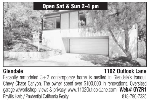 Glendale 1102 Outlook Lane Recently remodeled 3+2 contemporary home is nestled in Glendale’s tranquil Chevy Chase Canyon. The owner spent over $100,000 in renovations. Oversized garage w/workshop, views & privacy. www.1102OutlookLane.com Web# GYZR1 Phyllis Harb / Prudential California Realty 818-790-7325