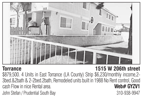 Torrance 1515 W 206th street $879,500. 4 Units in East Torrance (LA County) Strip $6,230/monthly income,2- 3bed.&2bath & 2-2bed.2bath, Remodeled units built in 1988 No Rent control, Good cash Flow in nice Rental area. Web# GYZV1 John Stefan / Prudential South Bay 310-938-9947