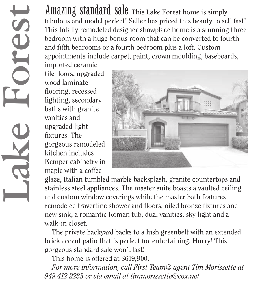 This home is offered at $619,900. For more information, call First Team® agent Tim Morissette at 949.412.2233 or via email at timmorissette@cox.net.