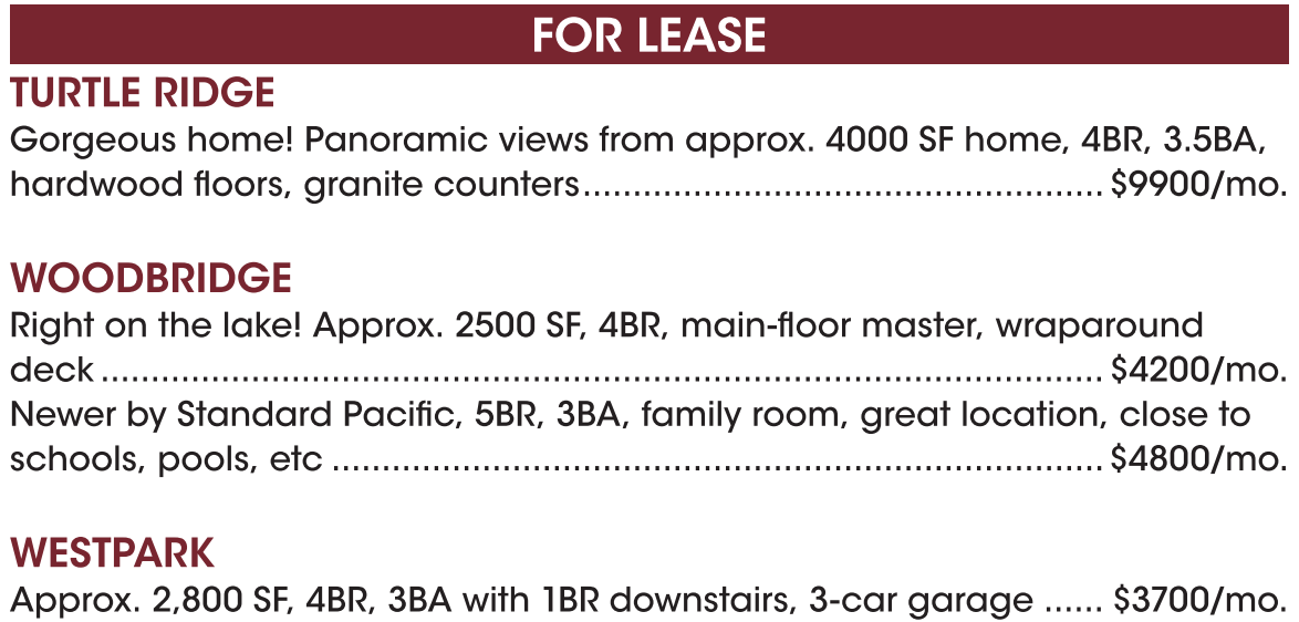 Right on the lake! Approx. 2500 SF, 4BR, main-fl oor master, wraparound deck .................................................................................................... $4200/mo. Newer by Standard Pacifi c, 5BR, 3BA, family room, great location, close to schools, pools, etc ............................................................................. $4800/mo.