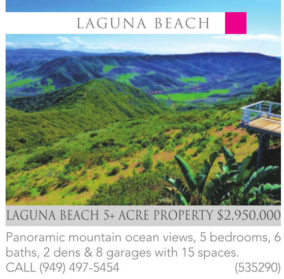 LAGUNA BEACH 5+ ACRE PROPERTY $2,950,000 Panoramic mountain ocean views, 5 bedrooms, 6 baths, 2 dens & 8 garages with 15 spaces. CALL (949) 497-5454 (535290)