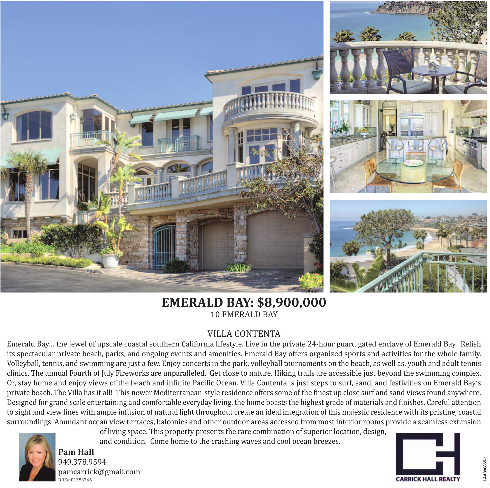 EMERALD BAY: $8,900,000 10 EMERALD BAY VILLA CONTENTA Emerald Bay… the jewel of upscale coastal southern California lifestyle. Live in the private 24-hour guard gated enclave of Emerald Bay. Relish its spectacular private beach, parks, and ongoing events and amenities. Emerald Bay offers organized sports and activities for the whole family. Volleyball, tennis, and swimming are just a few. Enjoy concerts in the park, volleyball tournaments on the beach, as well as, youth and adult tennis clinics. The annual Fourth of July Fireworks are unparalleled. Get close to nature. Hiking trails are accessible just beyond the swimming complex. Or, stay home and enjoy views of the beach and in inite Paci ic Ocean. Villa Contenta is just steps to surf, sand, and festivities on Emerald Bay’s private beach. The Villa has it all! This newer Mediterranean-style residence offers some of the inest up close surf and sand views found anywhere. Designed for grand scale entertaining and comfortable everyday living, the home boasts the highest grade of materials and inishes. Careful attention to sight and view lines with ample infusion of natural light throughout create an ideal integration of this majestic residence with its pristine, coastal surroundings. Abundant ocean view terraces, balconies and other outdoor areas accessed from most interior rooms provide a seamless extension of living space. This property presents the rare combination of superior location, design, and condition. Come home to the crashing waves and cool ocean breezes. Pam Hall 949.378.9594 pamcarrick@gmail.com DRE# 01383346