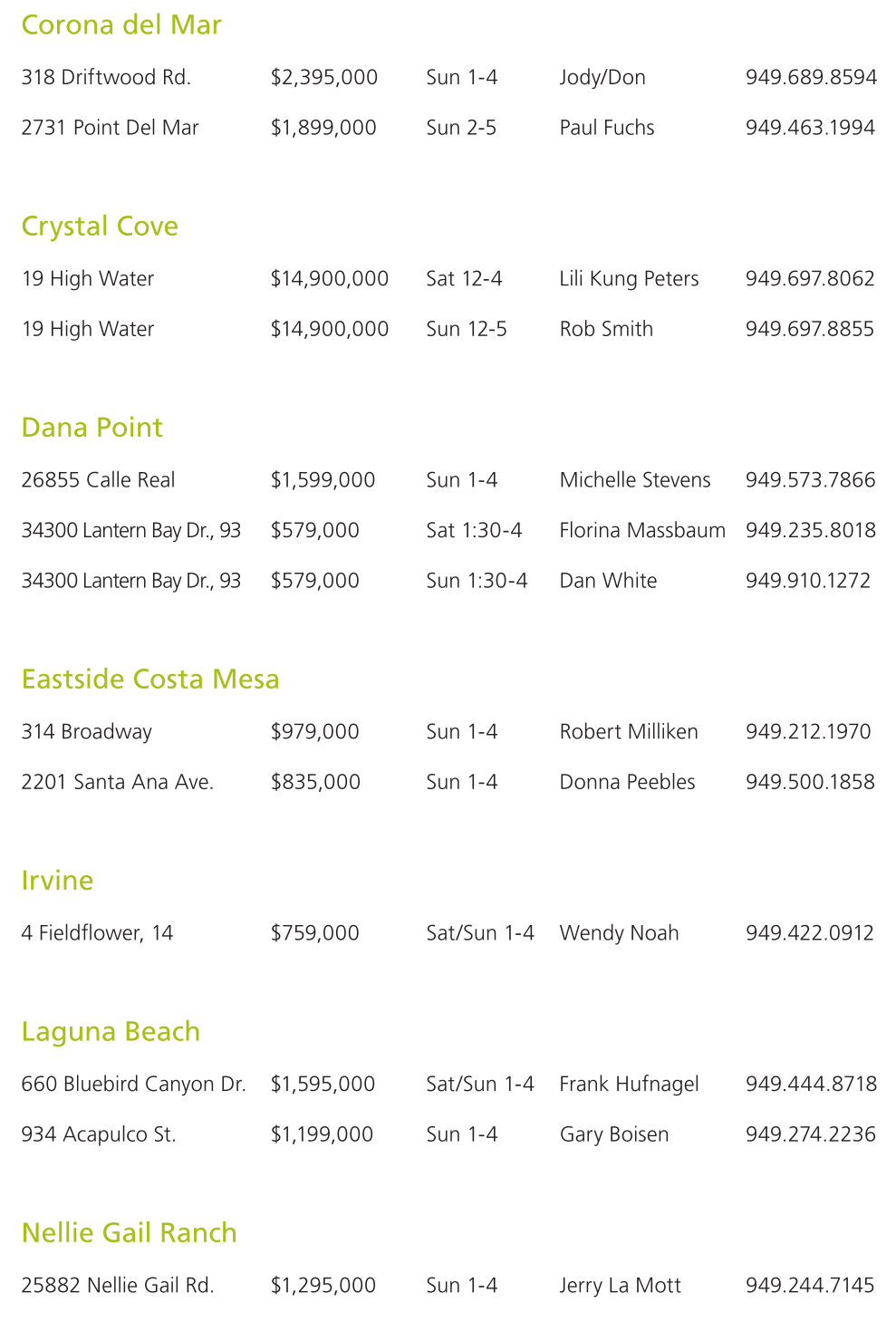 19 High Water $14,900,000 Sat 12-4 Lili Kung Peters 949.697.8062 19 High Water $14,900,000 Sun 12-5 Rob Smith 949.697.8855