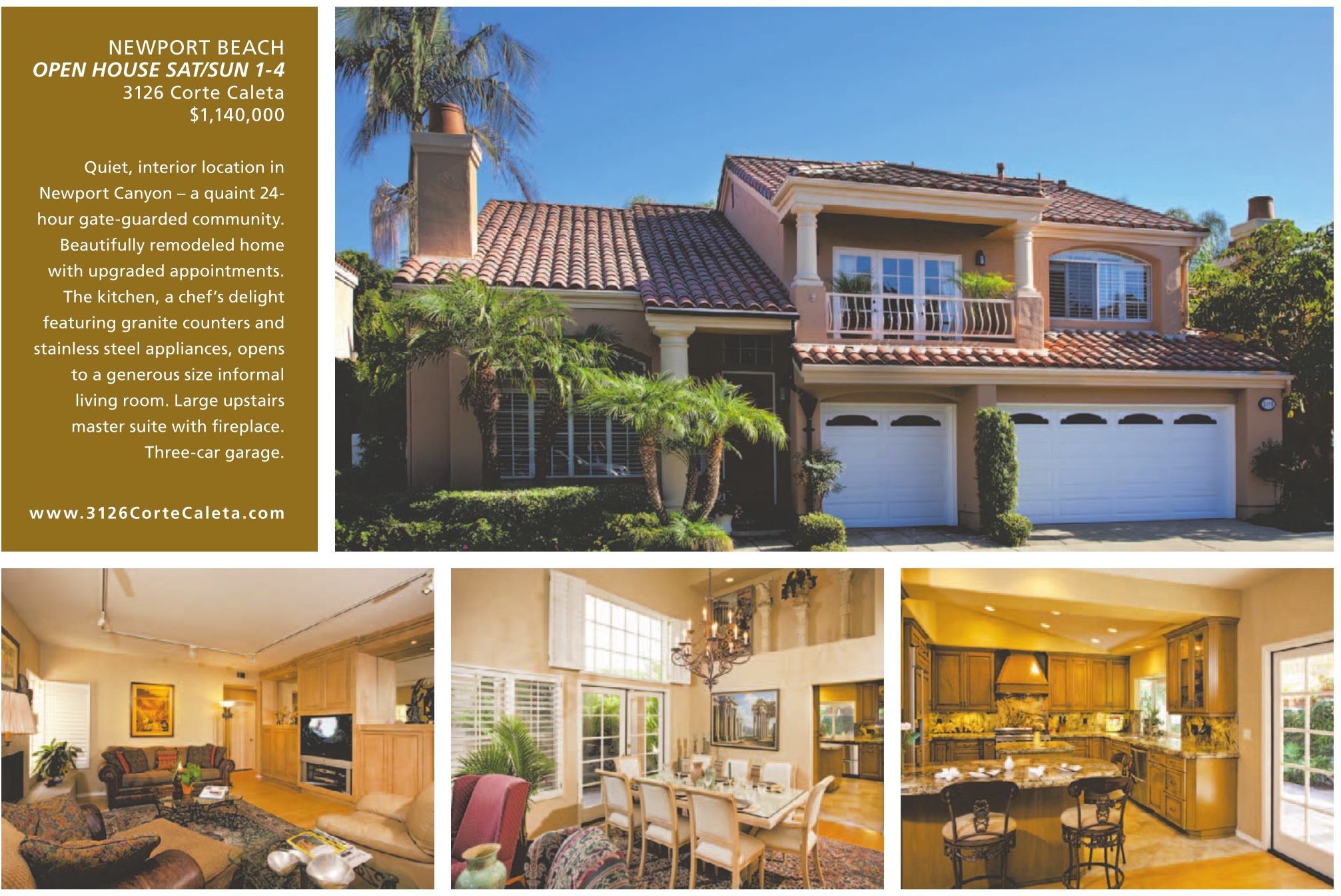 NEWPORT BEACH OPEN HOUSE SAT/SUN 1-4 3126 Corte Caleta $1,140,000 Quiet, interior location in Newport Canyon – a quaint 24- hour gate-guarded community. Beautifully remodeled home with upgraded appointments. The kitchen, a chef’s delight featuring granite counters and stainless steel appliances, opens to a generous size informal living room. Large upstairs master suite with fireplace. Three-car garage. www.3126CorteCaleta.com