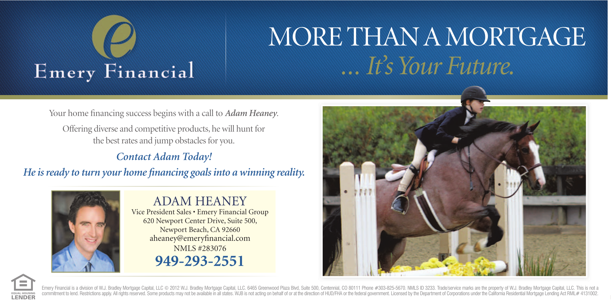 MORE THAN A MORTGAGE ... It’s Your Future. Your home financing success begins with a call to Adam Heaney. Offering diverse and competitive products, he will hunt for the best rates and jump obstacles for you. Contact Adam Today! He is ready to turn your home financing goals into a winning reality. ADAM HEANEY Vice President Sales • Emery Financial Group 620 Newport Center Drive, Suite 500, Newport Beach, CA 92660 aheaney@emeryfinancial.com NMLS #283076 949-293-2551 Emery Financial is a division of W.J. Bradley Mortgage Capital, LLC © 2012 W.J. Bradley Mortgage Capital, LLC. 6465 Greenwood Plaza Blvd, Suite 500, Centennial, CO 80111 Phone #303-825-5670. NMLS ID 3233. Trade/service marks are the property of W.J. Bradley Mortgage Capital, LLC. This is not a commitment to lend. Restrictions apply. All rights reserved. Some products may not be available in all states. WJB is not acting on behalf of or at the direction of HUD/FHA or the federal government. Licensed by the Department of Corporations under the California Residential Mortgage Lending Act RML# 4131002.