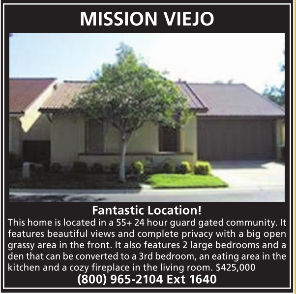 This home is located in a 55+ 24 hour guard gated community. It features beautiful views and complete privacy with a big open grassy area in the front. It also features 2 large bedrooms and a den that can be converted to a 3rd bedroom, an eating area in the kitchen and a cozy fireplace in the living room. $425,000 (800) 965-2104 Ext 1640
