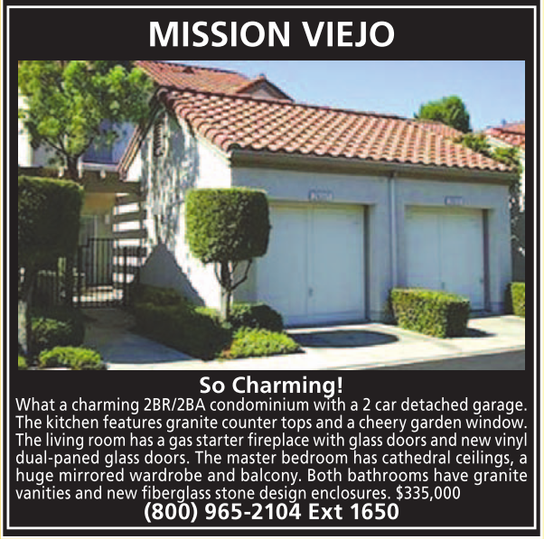 MISSION VIEJO So Charming! What a charming 2BR/2BA condominium with a 2 car detached garage. The kitchen features granite counter tops and a cheery garden window. The living room has a gas starter fireplace with glass doors and new vinyl dual-paned glass doors. The master bedroom has cathedral ceilings, a huge mirrored wardrobe and balcony. Both bathrooms have granite vanities and new fiberglass stone design enclosures. $335,000 (800) 965-2104 Ext 1650 See also