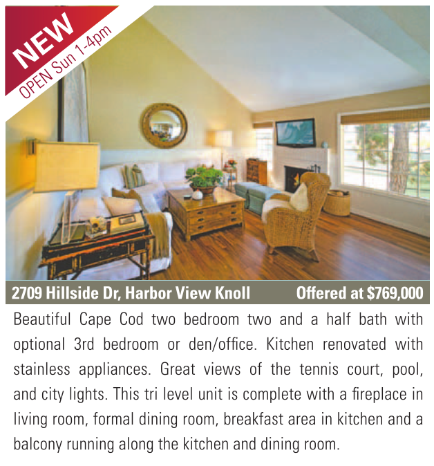 2709 Hillside Dr, Harbor View Knoll Offered at $769,000 Beautiful Cape Cod two bedroom two and a half bath with optional 3rd bedroom or den/office. Kitchen renovated with stainless appliances. Great views of the tennis court, pool, and city lights. This tri level unit is complete with a fireplace in living room, formal dining room, breakfast area in kitchen and a balcony running along the kitchen and dining room.