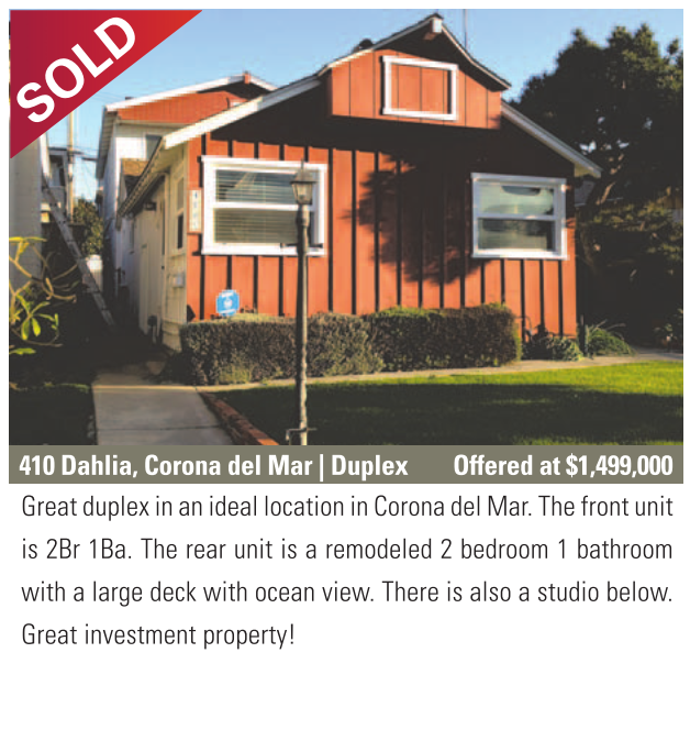 410 Dahlia, Corona del Mar | Duplex Offered at $1,499,000 Great duplex in an ideal location in Corona del Mar. The front unit is 2Br 1Ba. The rear unit is a remodeled 2 bedroom 1 bathroom with a large deck with ocean view. There is also a studio below. Great investment property!