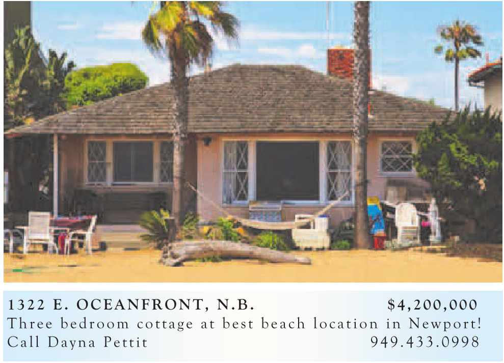 1322 E. OCEANFRONT, N.B. $4,200,000 Three bedroom cottage at best beach location in Newport! Call Dayna Pettit 949.433.0998