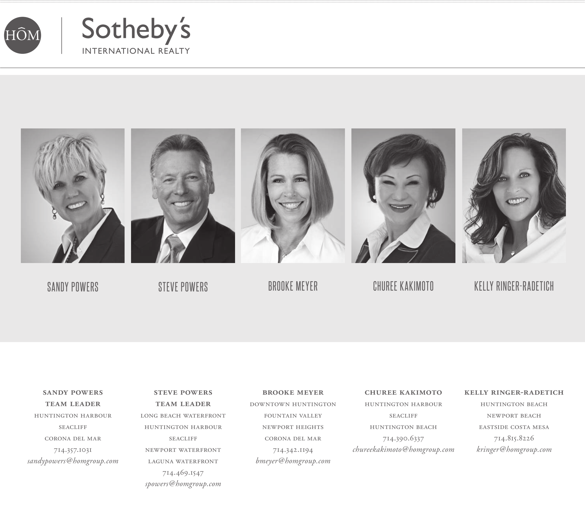 SANDY POWERS STEVE POWERS BROOKE MEYER CHUREE KAKIMOTO KELLY RINGER-RADETICH sandy powers team leader huntington harbour seacliff corona del mar 714.357.1031 sandypowers@homgroup.com steve powers team leader long beach waterfront huntington harbour seacliff newport waterfront laguna waterfront 714.469.1547 spowers@homgroup.com brooke meyer downtown huntington fountain valley newport heights corona del mar 714.342.1194 bmeyer@homgroup.com churee kakimoto huntington harbour seacliff huntington beach 714.390.6337 chureekakimoto@homgroup.com kelly ringer-radetich huntington beach newport beach eastside costa mesa 714.815.8226 kringer@homgroup.com