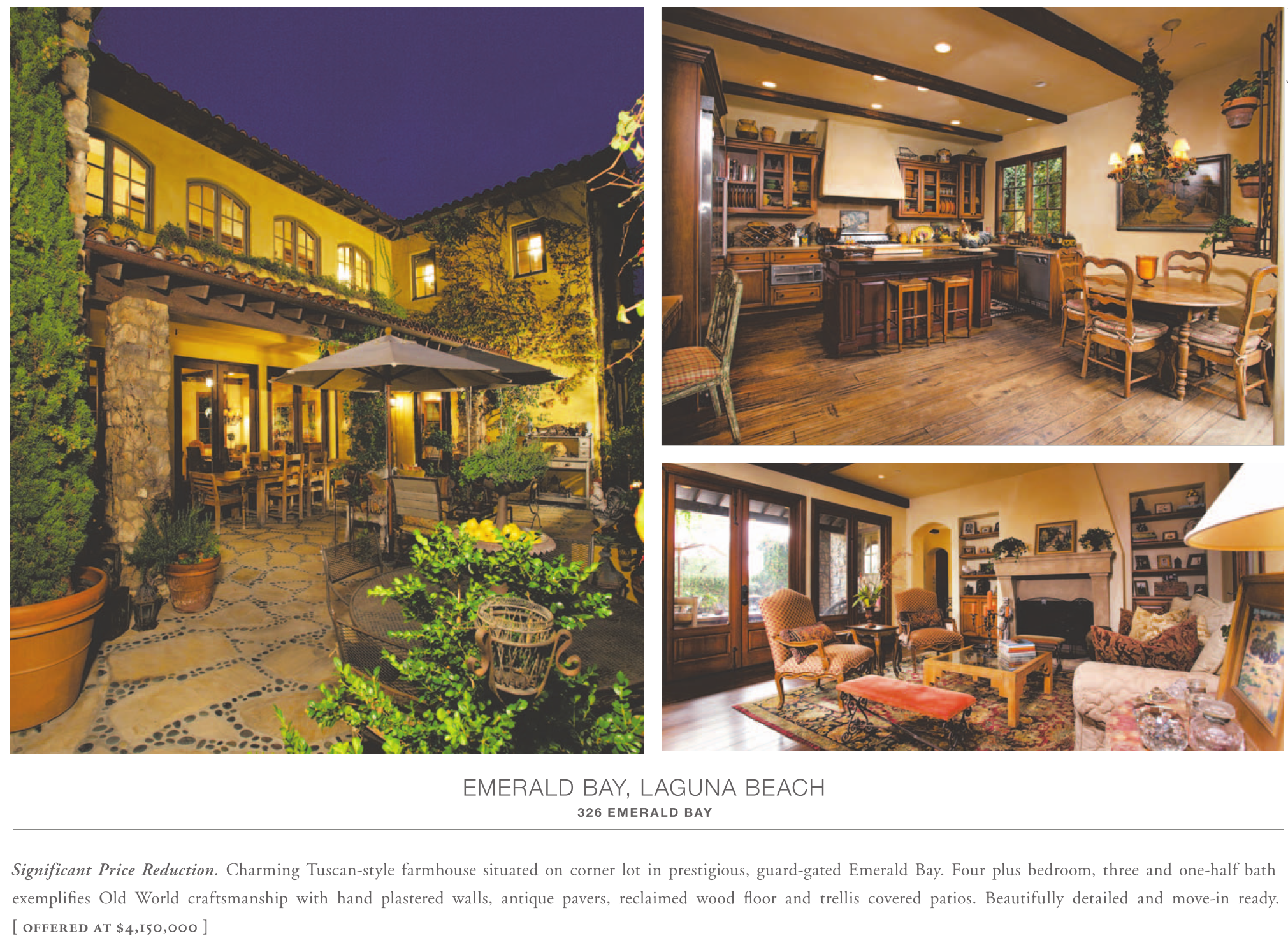 Significant Price Reduction. Charming Tuscan-style farmhouse situated on corner lot in prestigious, guard-gated Emerald Bay. Four plus bedroom, three and one-half bath exemplifies Old World craftsmanship with hand plastered walls, antique pavers, reclaimed wood floor and trellis covered patios. Beautifully detailed and move-in ready. [ offered at $4,150,000 ]