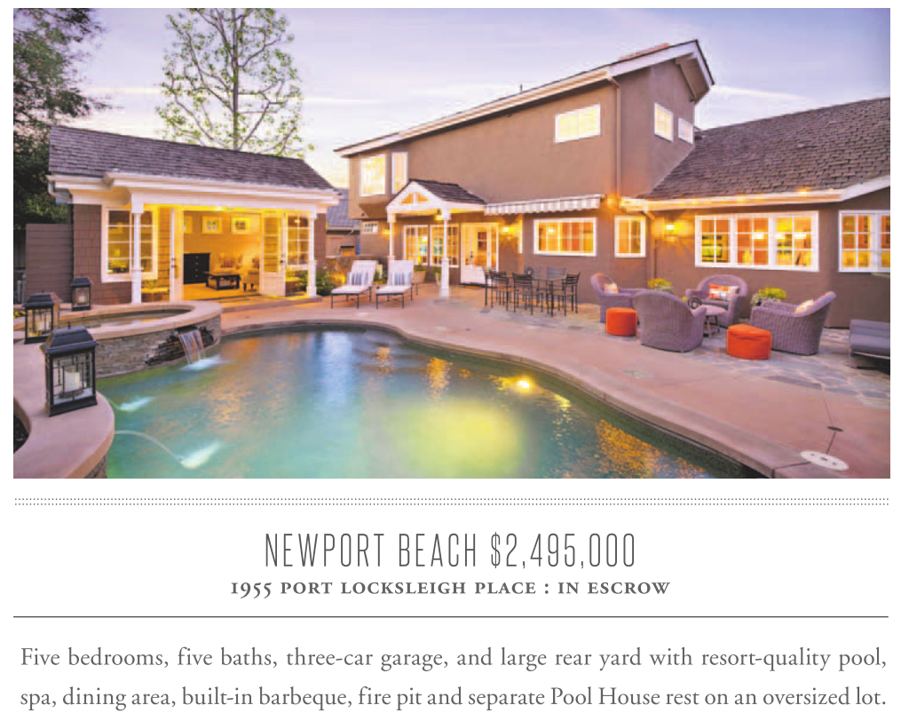 NEWPORT BEACH $2,495,000 1955 port locksleigh place : in escrow Five bedrooms, five baths, three-car garage, and large rear yard with resort-quality pool, spa, dining area, built-in barbeque, fire pit and separate Pool House rest on an oversized lot.