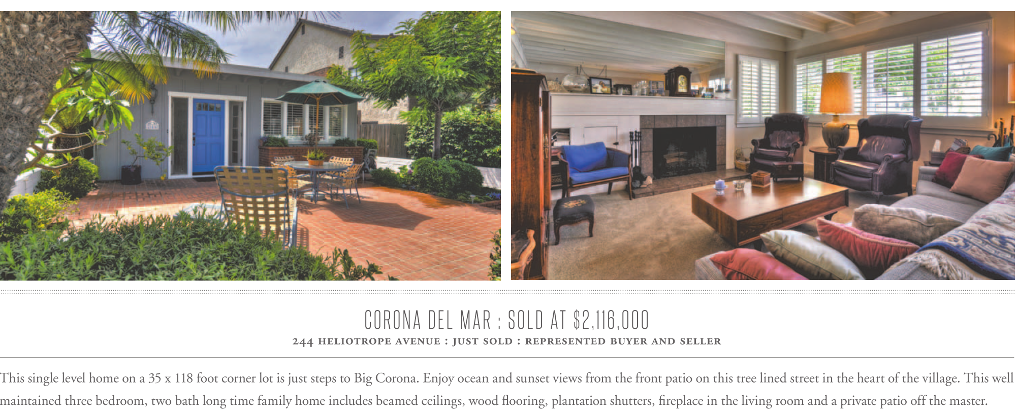 CORONA DEL MAR : SOLD AT $2,116,000 244 heliotrope avenue : just sold : represented buyer and seller This single level home on a 35 x 118 foot corner lot is just steps to Big Corona. Enjoy ocean and sunset views from the front patio on this tree lined street in the heart of the village. This well maintained three bedroom, two bath long time family home includes beamed ceilings, wood flooring, plantation shutters, fireplace in the living room and a private patio off the master.