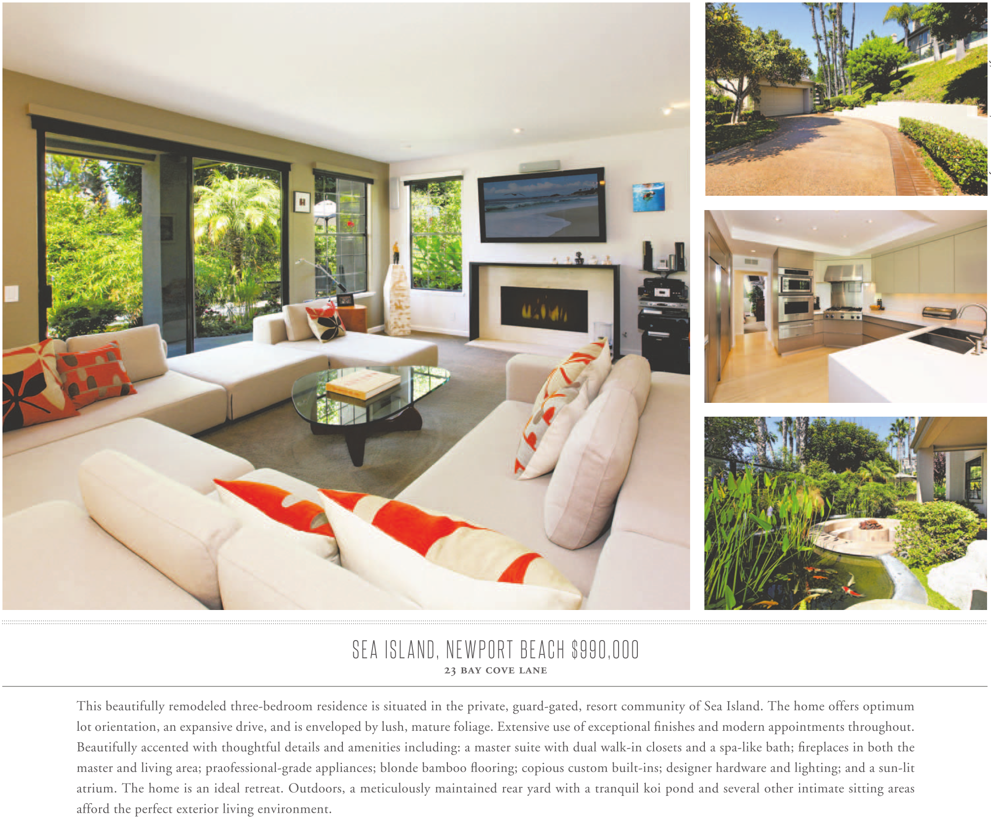 This beautifully remodeled three-bedroom residence is situated in the private, guard-gated, resort community of Sea Island. The home offers optimum lot orientation, an expansive drive, and is enveloped by lush, mature foliage. Extensive use of exceptional finishes and modern appointments throughout. Beautifully accented with thoughtful details and amenities including: a master suite with dual walk-in closets and a spa-like bath; fireplaces in both the master and living area; praofessional-grade appliances; blonde bamboo flooring; copious custom built-ins; designer hardware and lighting; and a sun-lit atrium. The home is an ideal retreat. Outdoors, a meticulously maintained rear yard with a tranquil koi pond and several other intimate sitting areas afford the perfect exterior living environment.