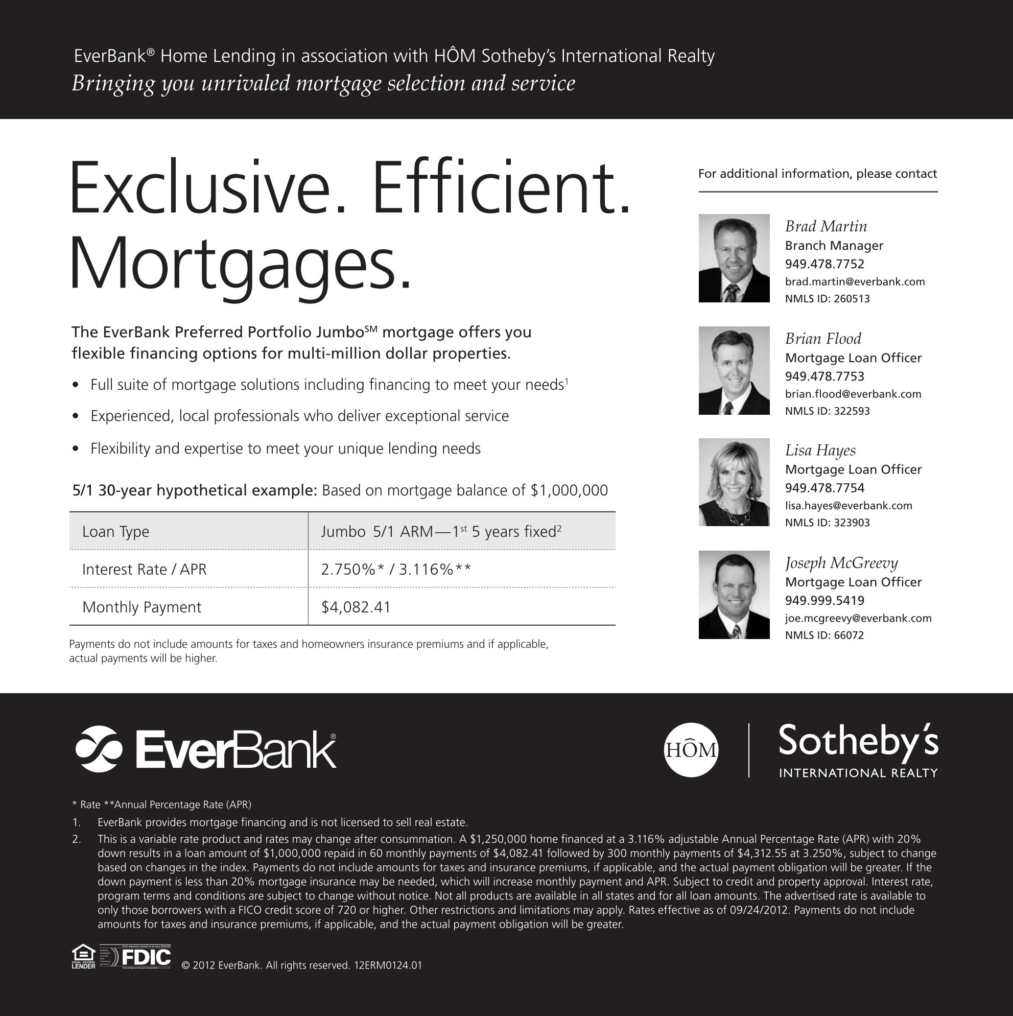 * Rate **Annual Percentage Rate (APR) 1. EverBank provides mortgage financing and is not licensed to sell real estate. 2. This is a variable rate product and rates may change after consummation. A $1,250,000 home financed at a 3.116% adjustable Annual Percentage Rate (APR) with 20% down results in a loan amount of $1,000,000 repaid in 60 monthly payments of $4,082.41 followed by 300 monthly payments of $4,312.55 at 3.250%, subject to change based on changes in the index. Payments do not include amounts for taxes and insurance premiums, if applicable, and the actual payment obligation will be greater. If the down payment is less than 20% mortgage insurance may be needed, which will increase monthly payment and APR. Subject to credit and property approval. Interest rate, program terms and conditions are subject to change without notice. Not all products are available in all states and for all loan amounts. The advertised rate is available to only those borrowers with a FICO credit score of 720 or higher. Other restrictions and limitations may apply. Rates effective as of 09/24/2012. Payments do not include amounts for taxes and insurance premiums, if applicable, and the actual payment obligation will be greater.