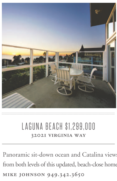 Panoramic sit-down ocean and Catalina views from both levels of this updated, beach-close home. mike johnson 949.342.3650