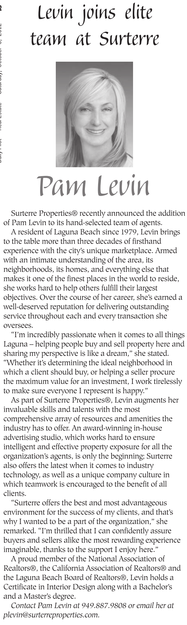 Contact Pam Levin at 949.887.9808 or email her at plevin@surterreproperties.com.