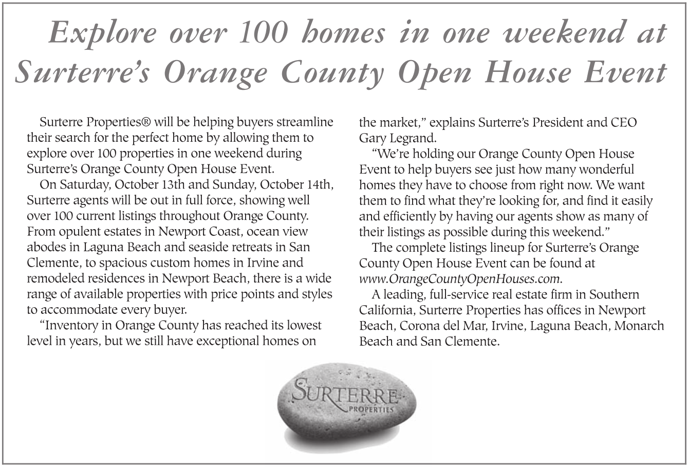 Explore over 100 homes in one weekend at Surterre’s Orange County Open House Event Surterre Properties® will be helping buyers streamline their search for the perfect home by allowing them to explore over 100 properties in one weekend during Surterre’s Orange County Open House Event. On Saturday, October 13th and Sunday, October 14th, Surterre agents will be out in full force, showing well over 100 current listings throughout Orange County. From opulent estates in Newport Coast, ocean view abodes in Laguna Beach and seaside retreats in San Clemente, to spacious custom homes in Irvine and remodeled residences in Newport Beach, there is a wide range of available properties with price points and styles to accommodate every buyer. “Inventory in Orange County has reached its lowest level in years, but we still have exceptional homes on the market,” explains Surterre’s President and CEO Gary Legrand. “We’re holding our Orange County Open House Event to help buyers see just how many wonderful homes they have to choose from right now. We want them to find what they’re looking for, and find it easily and efficiently by having our agents show as many of their listings as possible during this weekend.” The complete listings lineup for Surterre’s Orange County Open House Event can be found at www.OrangeCountyOpenHouses.com. A leading, full-service real estate firm in Southern California, Surterre Properties has offices in Newport Beach, Corona del Mar, Irvine, Laguna Beach, Monarch Beach and San Clemente.