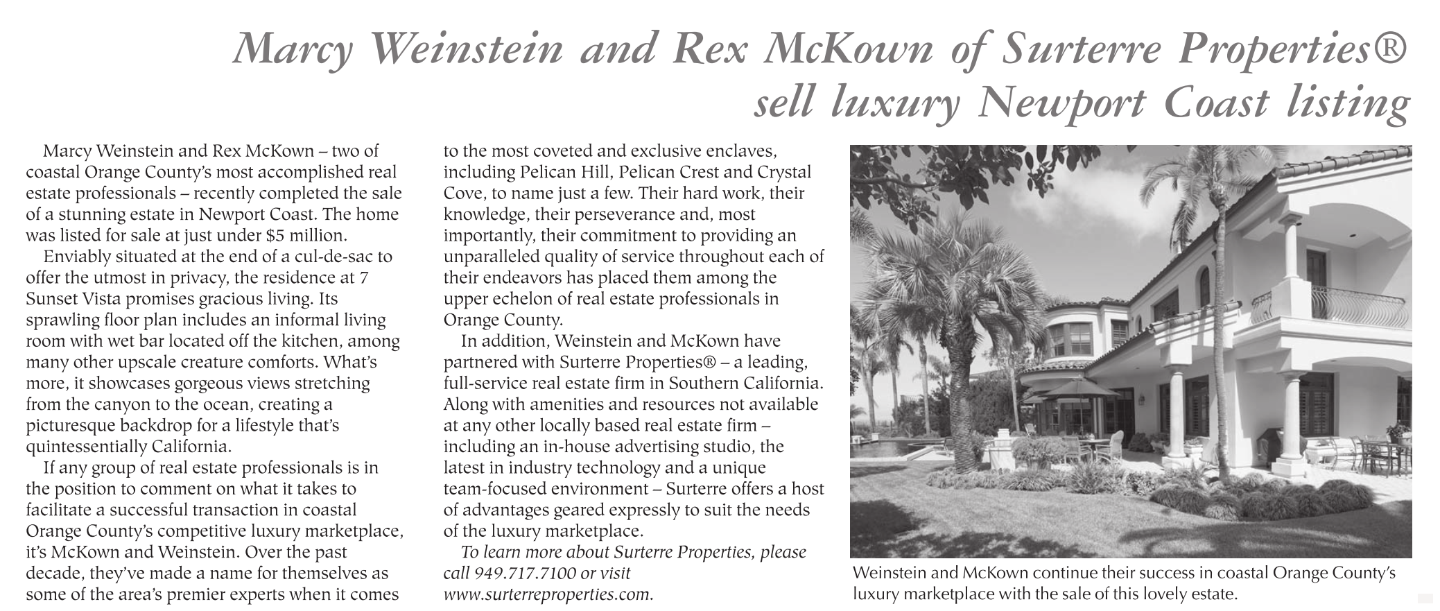 Marcy Weinstein and Rex McKown of Surterre Properties® sell luxury Newport Coast listing