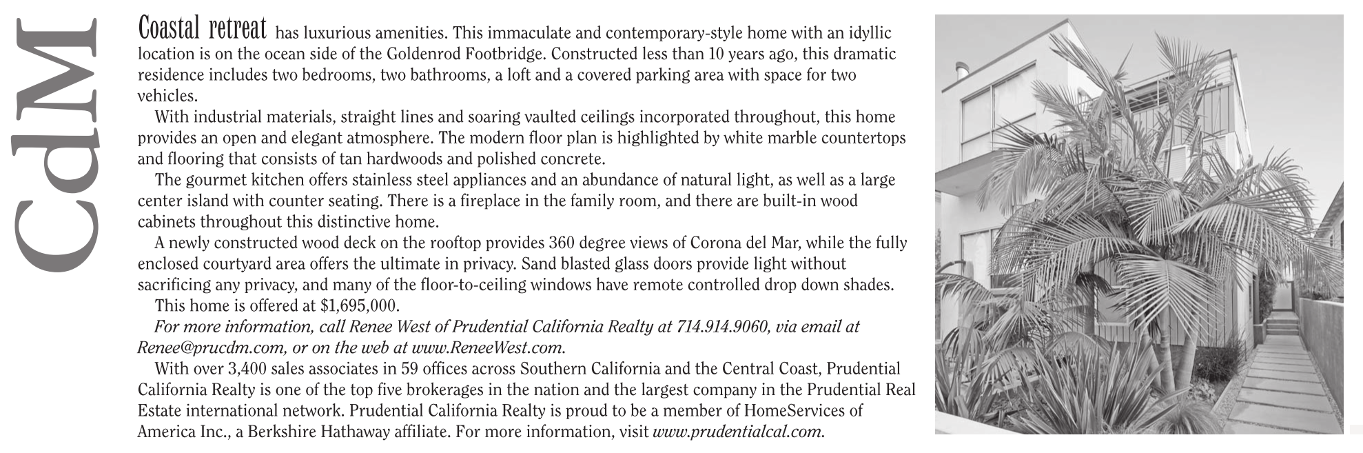 This home is offered at $1,695,000. For more information, call Renee West of Prudential California Realty at 714.914.9060, via email at Renee@prucdm.com, or on the web at www.ReneeWest.com.