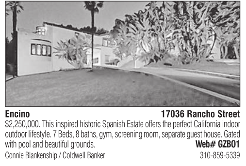 Encino 17036 Rancho Street $2,250,000. This inspired historic Spanish Estate offers the perfect California indoor outdoor lifestyle. 7 Beds, 8 baths, gym, screening room, separate guest house. Gated with pool and beautiful grounds. Web# GZBO1 Connie Blankenship / Coldwell Banker 310-859-5339