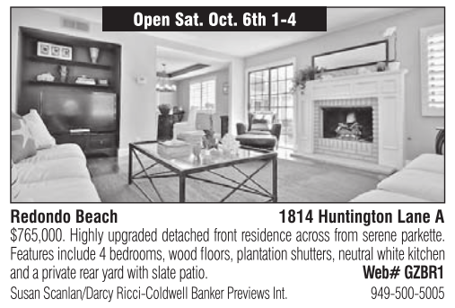 Open Sat. Oct. 6th 1-4 Redondo Beach 1814 Huntington Lane A $765,000. Highly upgraded detached front residence across from serene parkette. Features include 4 bedrooms, wood floors, plantation shutters, neutral white kitchen and a private rear yard with slate patio. Web# GZBR1 Susan Scanlan/Darcy Ricci-Coldwell Banker Previews Int. 949-500-5005