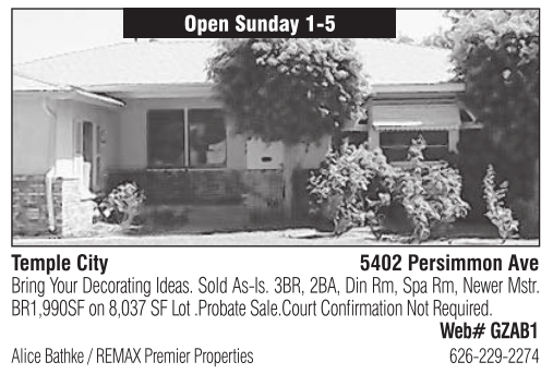 Temple City 5402 Persimmon Ave Bring Your Decorating Ideas. Sold As-Is. 3BR, 2BA, Din Rm, Spa Rm, Newer Mstr. BR1,990SF on 8,037 SF Lot .Probate Sale.Court Confirmation Not Required. Web# GZAB1 Alice Bathke / REMAX Premier Properties 626-229-2274