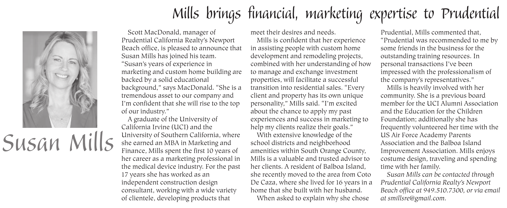 Susan Mills can be contacted through Prudential California Realty’s Newport Beach office at 949.510.7300, or via email at smillsre@gmail.com.