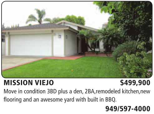 MISSION VIEJO $499,900 Move in condition 3BD plus a den, 2BA,remodeled kitchen,new flooring and an awesome yard with built in BBQ.
