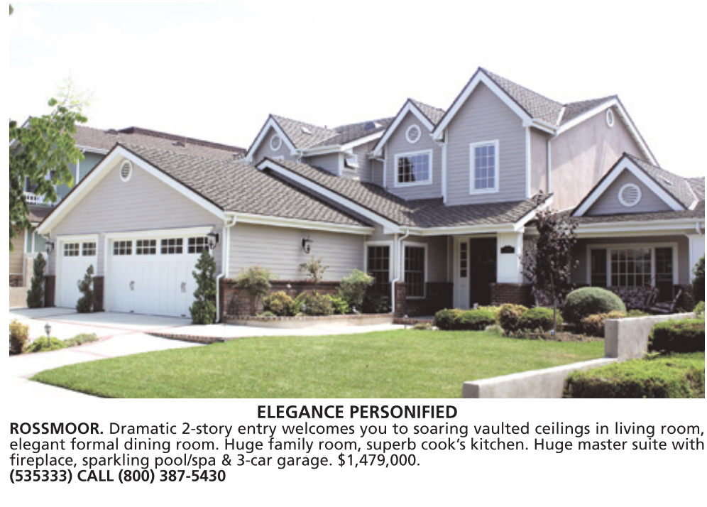 ELEGANCE PERSONIFIED ROSSMOOR. Dramatic 2-story entry welcomes you to soaring vaulted ceilings in living room, elegant formal dining room. Huge family room, superb cook’s kitchen. Huge master suite with fireplace, sparkling pool/spa & 3-car garage. $1,479,000. (535333) CALL (800) 387-5430