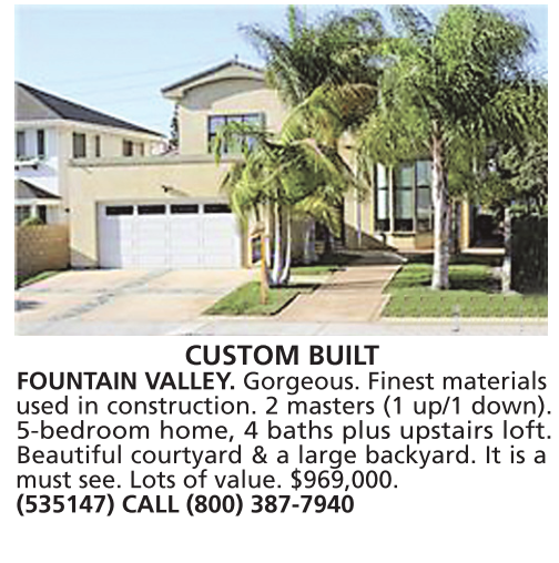CUSTOM BUILT FOUNTAIN VALLEY. Gorgeous. Finest materials used in construction. 2 masters (1 up/1 down). 5-bedroom home, 4 baths plus upstairs loft. Beautiful courtyard & a large backyard. It is a must see. Lots of value. $969,000. (535147) CALL (800) 387-7940
